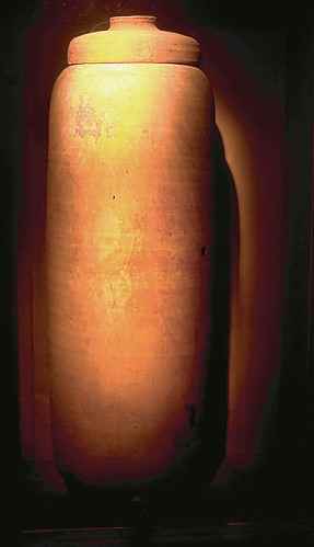 | [PAG.4 DI 13] A sinistra vediamo una delle numerose giare che sono state trovate all'interno delle grotte di Qumran. Dentro le giare erano conservati i manoscritti. Qui sotto vediamo il rotolo 1QH prima di essere aperto.